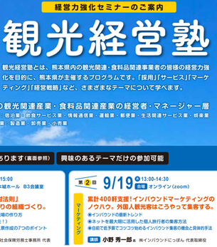 熊本県主催の観光経営塾にて宿泊施設向けのセミナーの講師を務めさせてきます。9月19日オンライン開催です。熊本県の旅館経営者の皆様、宜しくお願い致します。